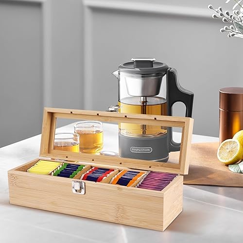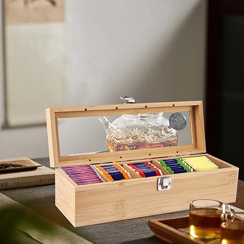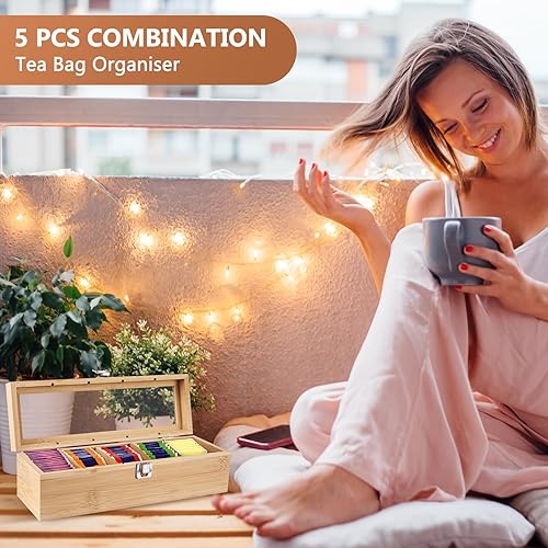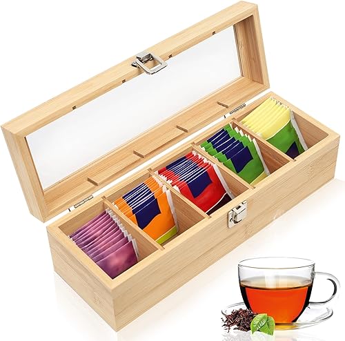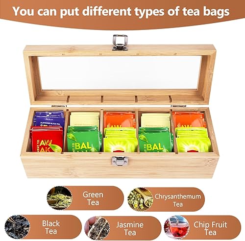 SiGuLiKeJi Boite a The Compartiments, Boîte à thé en Bois avec 5 Compartiments, Boite The, Grande Boite de Conservation Thé en Bois avec Couvercle pour Sachets de Thé épices Café, 30 x 10 x 9 cm