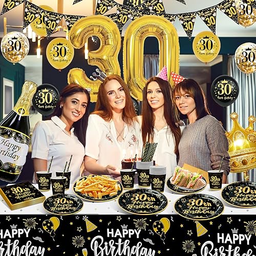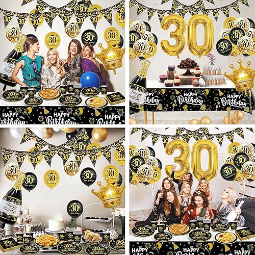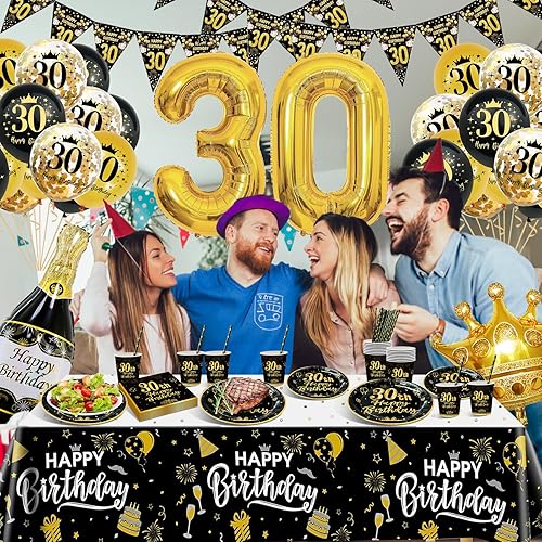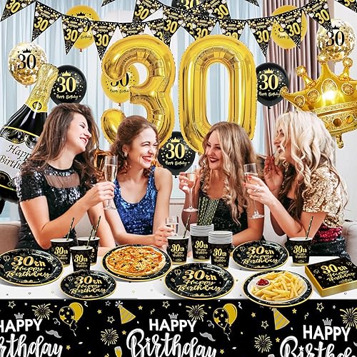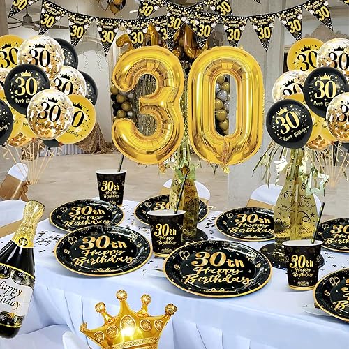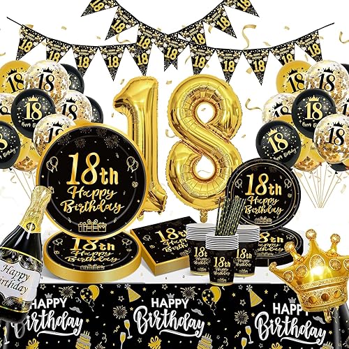 Decoration Anniversaire 18 Ans, Vaisselle Anniversaire Noir et Or, 16 Invités Vaisselle Assiettes de Fête Decoration avec Ballons, Nappe, Gobelets, Papier Serviettes pour Deco Anniversaire 18