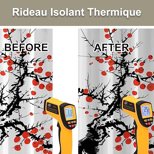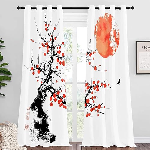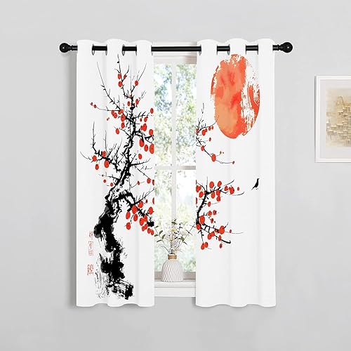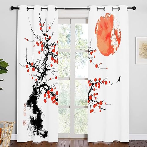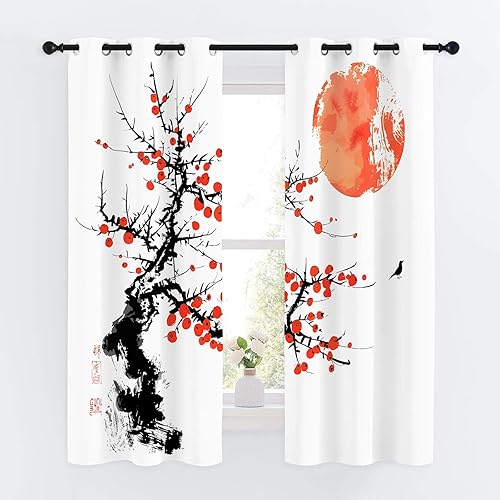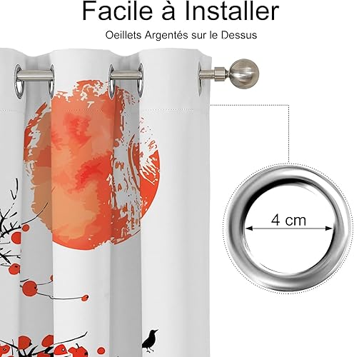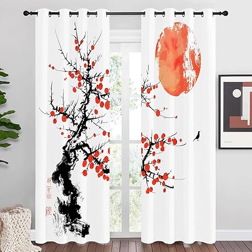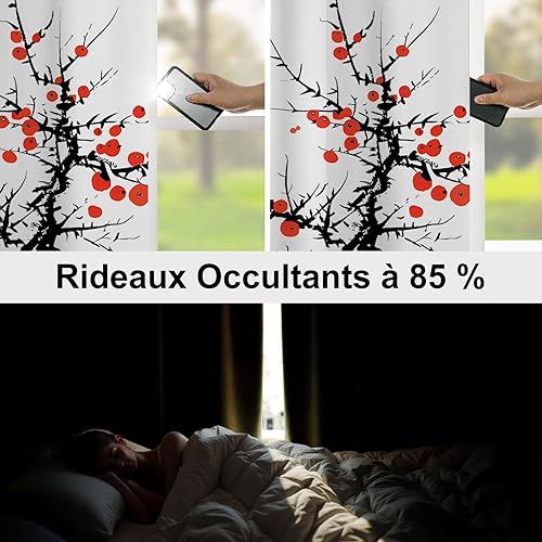 Rideau Occultant Motif Plante, Rideaux Rouge Noir 2 Pièces L 140 x H 230, Thermique Anti UV Tenture Opaque à Oeillets Style Japonais Decoration Chambre Maison Salon Intérieurs, A48