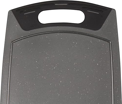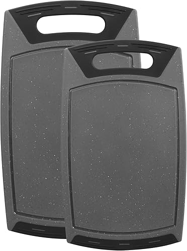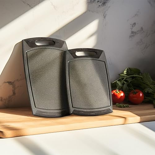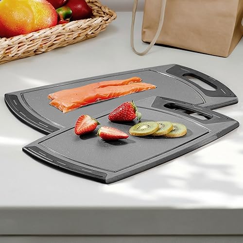 STONELINE Planches à Découper, Lot de 2 pcs, Petite 36 x 22 cm et Grande 42 x 25 cm, avec Rainures à Jus, Antidérapantes, Planche à Découper en Plastique, Couleur Gris
