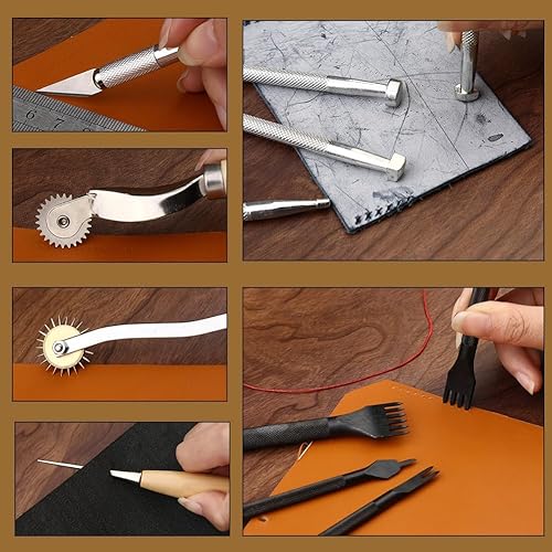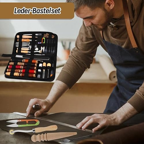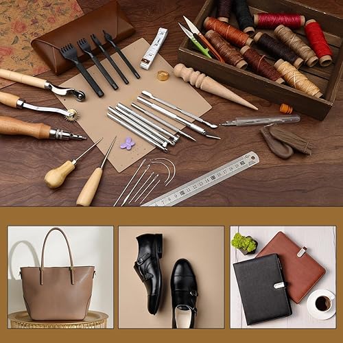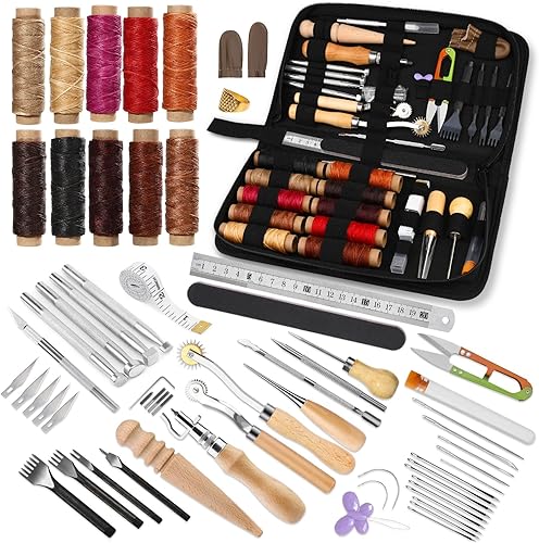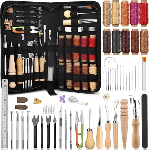 Wamkon Lot de 60 outils de travail du cuir, kit de couture en cuir, outils d'artisanat du cuir avec sac de rangement, outils d'estampage, de nutrile, poinçon pour loisirs créatifs, couture et