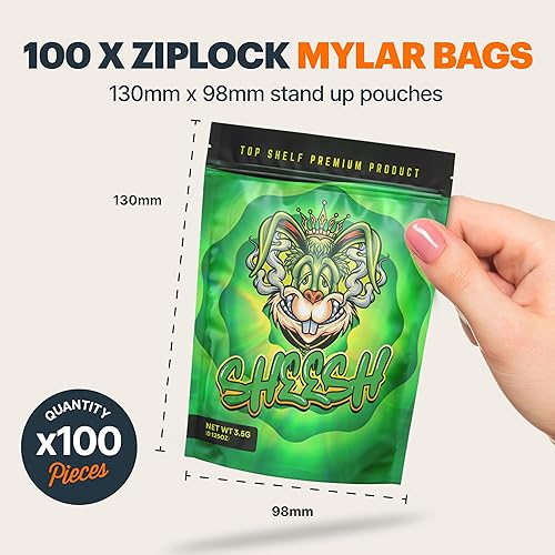 Partie 2 - 100 sacs refermables en mylar (9,8 cm x 13 cm) - Pochettes de rangement hermétiques avec fermeture à glissière, petites résistantes, capacité de 3,5 g - Usage alimentaire ou artisanal
