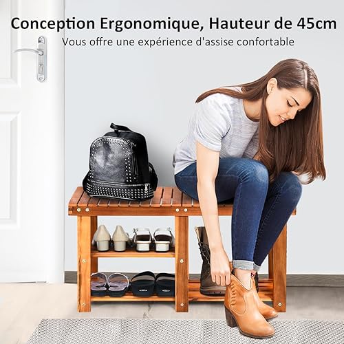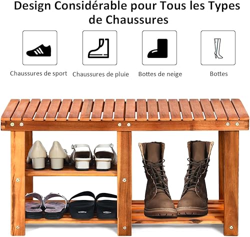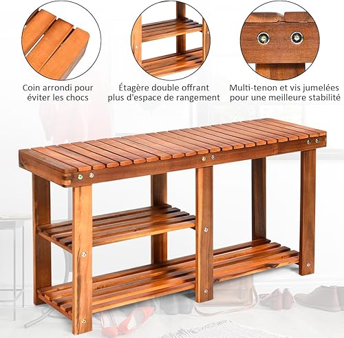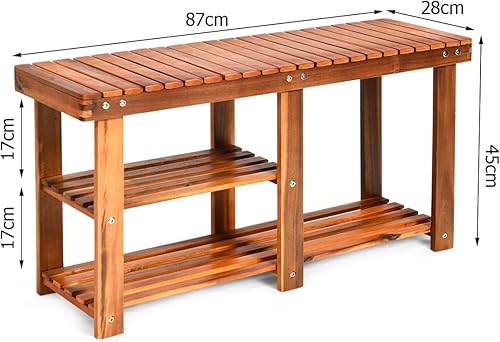 COSTWAY Banc à Chaussures en Bois d'Acacia, Étagère de Rangement à 3 Niveaux, Charge 160 kg, pour l’Entrée, Salon, Salle de Bain, Couloir, Jardin 28 x 87 x 45 cm, Roux