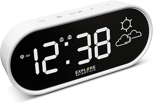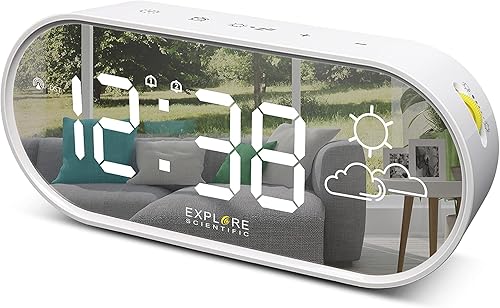 Explore Scientific RDC2002W Horloge avec Affichage Miroir, Heure et température intérieure, prévisions du Temps à icônes, Double Alarme, 3 Niveaux de luminosité, contrôle Soft Touch, Port USB, Blanc
