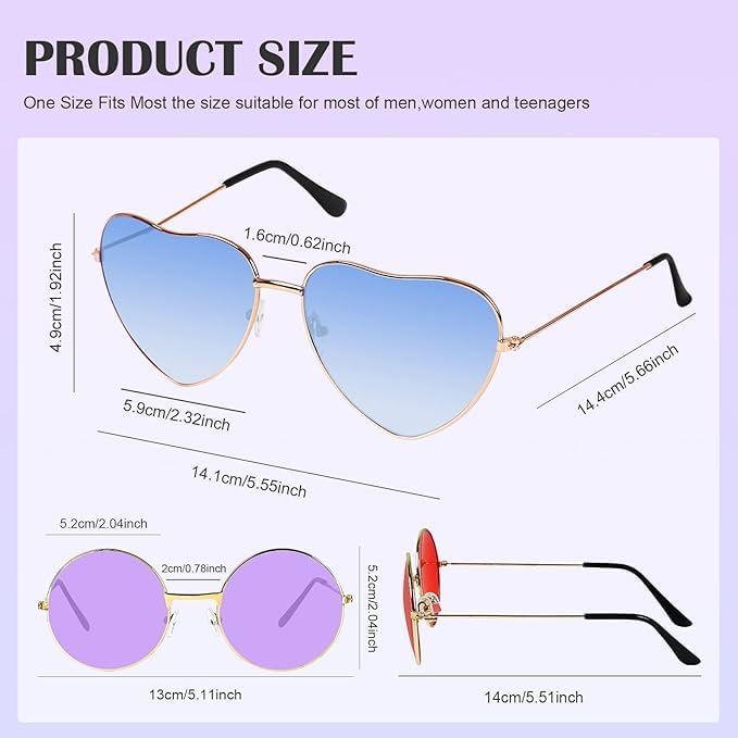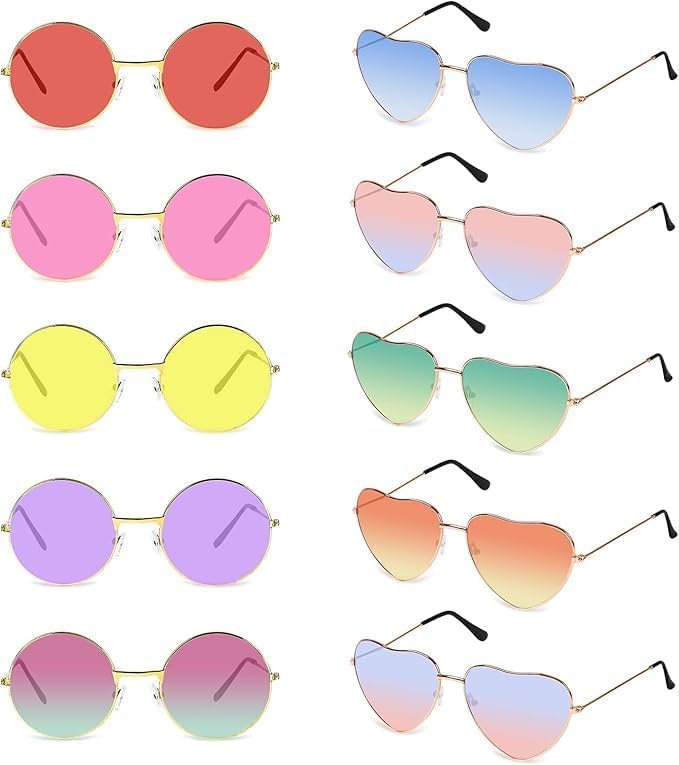 10 Paires Lunettes de Fête, Lunettes en Forme de Coeur + Lunettes de Soleil Rondes, Lunettes Vintage Hippie de Couleur, Lunettes de Fête Décoratives pour Party Annivesaire