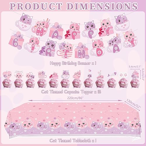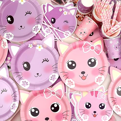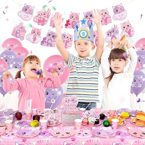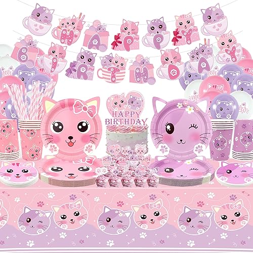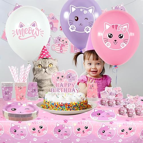 Ensemble de fournitures de fête d'anniversaire pour chat comprenant une bannière « Happy Birthday », des assiettes, une nappe, des tasses, des ballons et des pailles pour décorations de fête pour