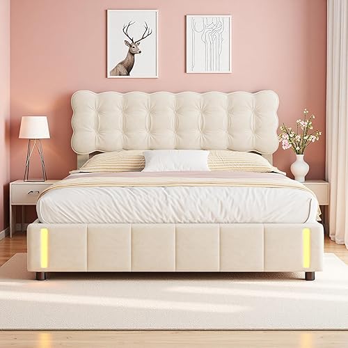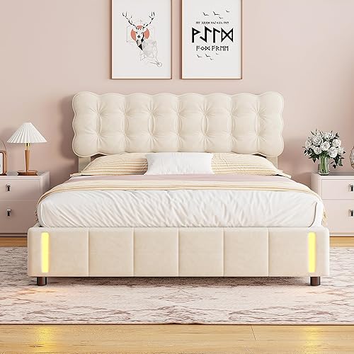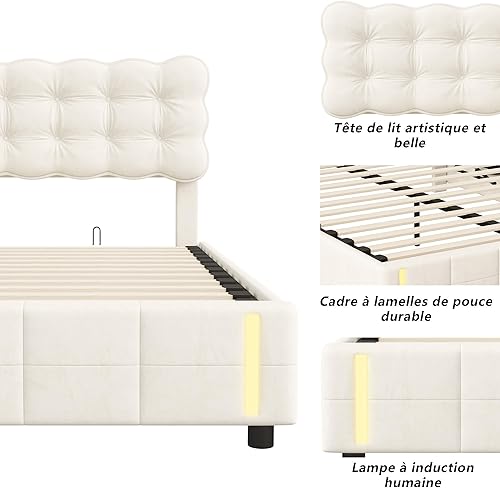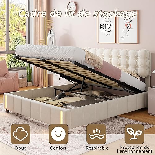 Générique Lit Coffre 160x200 avec LED & Système Hydraulique – Velours Beige Clair Capitonné, Rangement Spacieux & Sommier à Lattes, sans Matelas