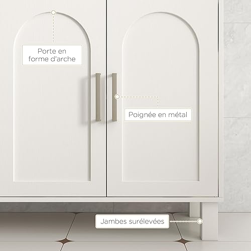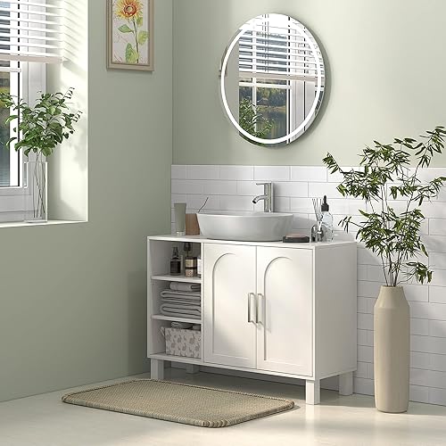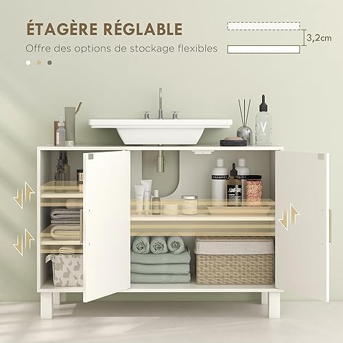 HOMCOM Meuble sous lavabo, Meuble de Salle de Bain, avec Placard à Deux Niveaux, 2 Portes, étagères réglables, sur Pieds, en Bois, 90 x 30 x 63 cm, crème
