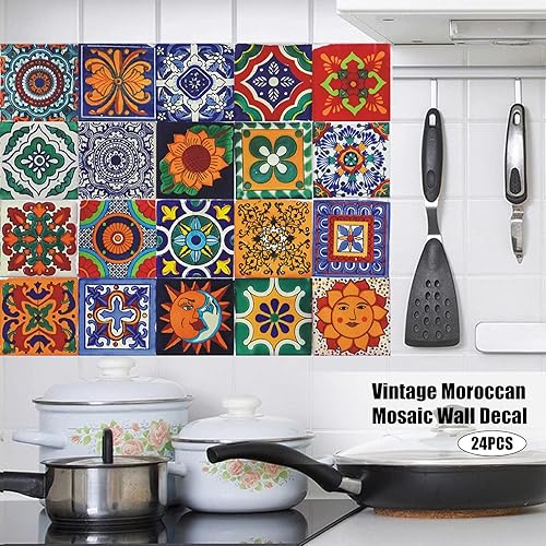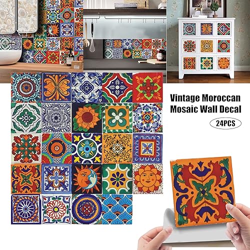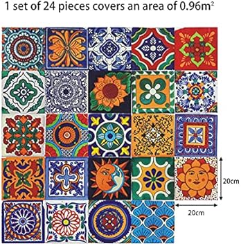 24 pcs Autocollants Muraux en Vinyle pour Carrelage Marocain Vintage Auto-Adhésif DIY Stickers - Décoration d'intérieur pour Cuisine, Bains, Cuisine(20 x 20 cm)