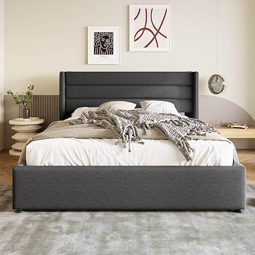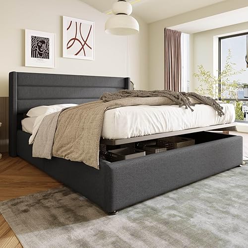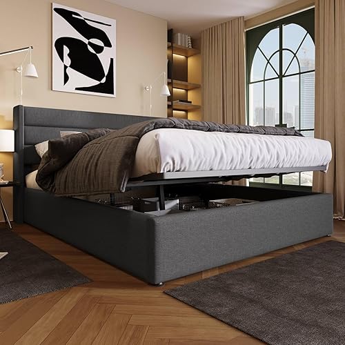 KOMHTOM Lit Double Rembourré Hydraulique de Rangement,Moderne lit Coffre avec Tête,Cadre de lit avec Cadre en métal, Sommier à Lattes en Bois(sans Matelas) (Beige, 180x200 CM)