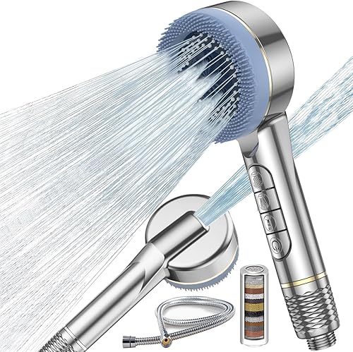 HOAENTSA Pomme de douche à eau dure et tuyau de 1,5 m, 4 modes de jet, filtre à 15 couches, économie d'eau, filtre de douche massant pour enlever le chlore résiduel