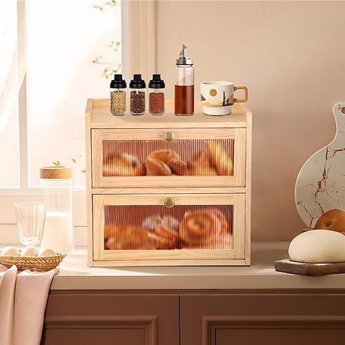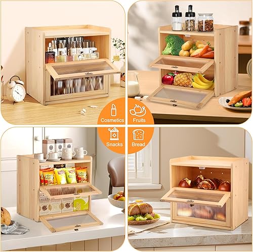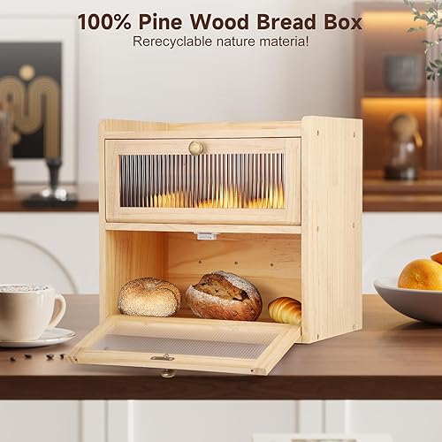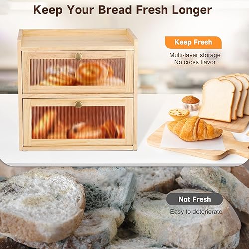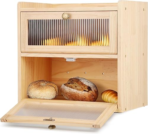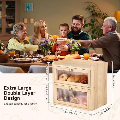 Boîte à Pain à 2 Couches pour Comptoir de Cuisine, Boîte à Pain en Bois avec Fenêtres, Récipient pour Aliments Secs avec Ventilation pour Garder la Pain au Frais, à Monter Soi-même(Couleur du bois)