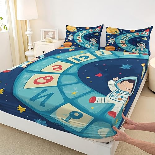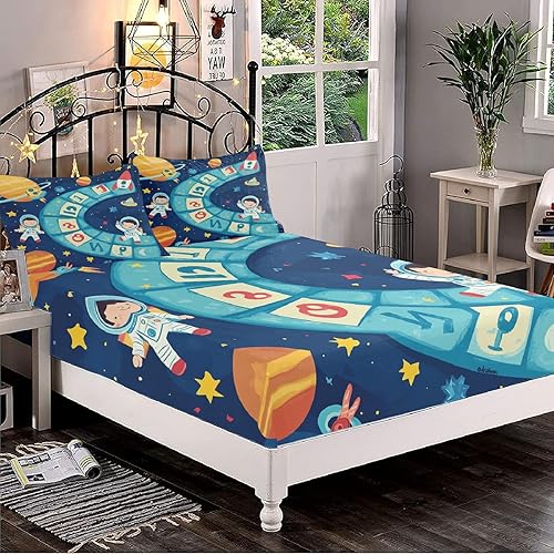 Draps Housses 80x160 cm Poche Profonde de 30 cm pour 1 Personnes, ThèMe de l'espace Mignon Parure de Lit 3 pièces Microfibre Brossé Extra Doux, Bleu Résistant Décoloration Drap Housse