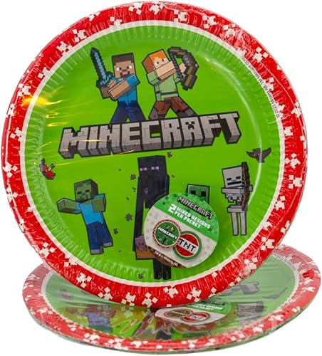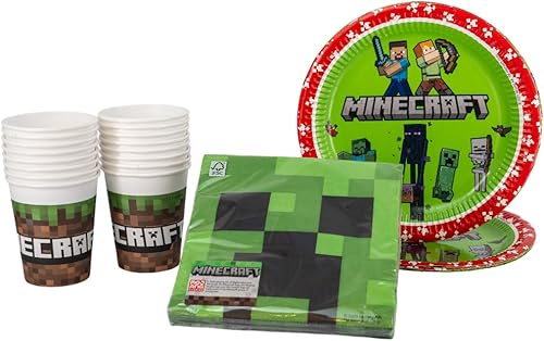 SPARKLERS CLUB Pack de fête Minecraft, Lot de 52 pièces, 16 assiettes, 16 gobelets, 20 serviettes, vaisselle jetable, vaisselle de fête, décoration de table