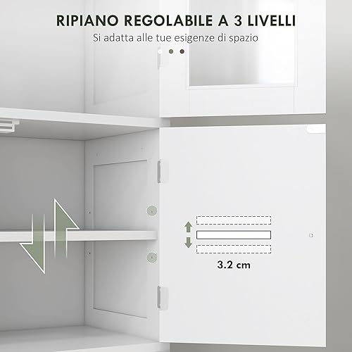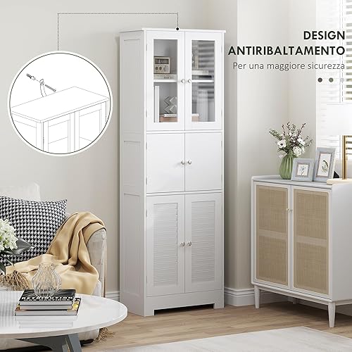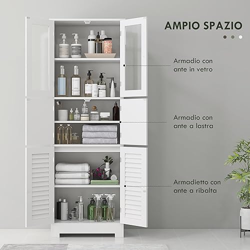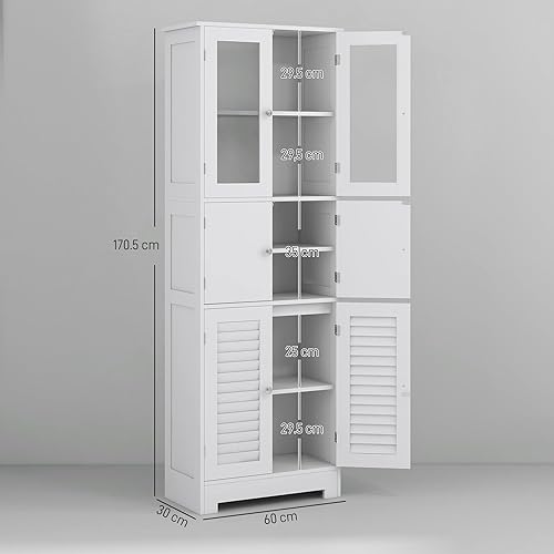 HOMCOM Armoire Colonne de Salle de Bain avec 3 placards avec 2 Portes, Armoire Polyvalente avec Portes en Verre et Volets, 60x30x170.5cm, Blanc