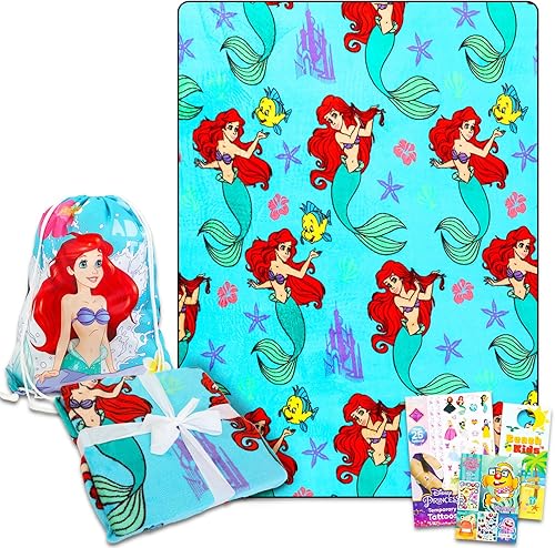 Ensemble couverture polaire Little Mermaid et sac à cordon – Ensemble avec couverture douce Ariel et sac à pince, autocollants, plus pour enfants, adultes, enfants | Couverture polaire confortable