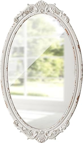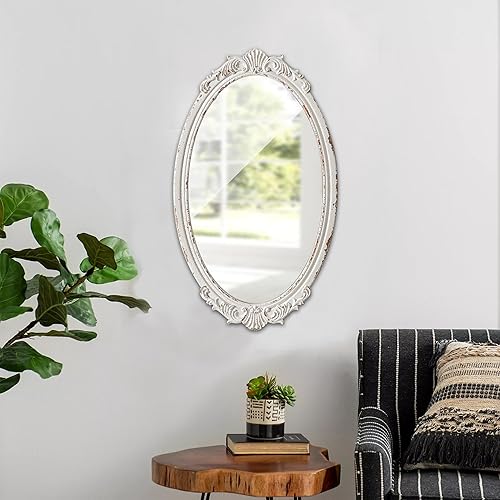 Sintosin Miroir Mural Ovale Baroque 60 x 35 cm, Miroirs Vintage Blancs Déprimés pour Le Salon, Miroirs en Bois pour Salle de Bain, Entrée, Miroir Mural Design horizontaux ou verticaux