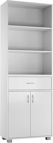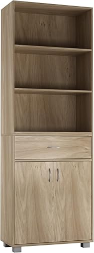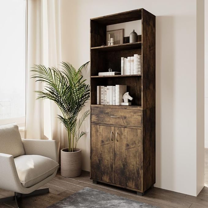 URBNLIVING Bibliothèque haute en bois à 5 niveaux avec étagères ouvertes et tiroirs de rangement (marron rustique)