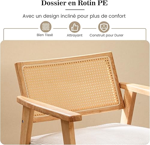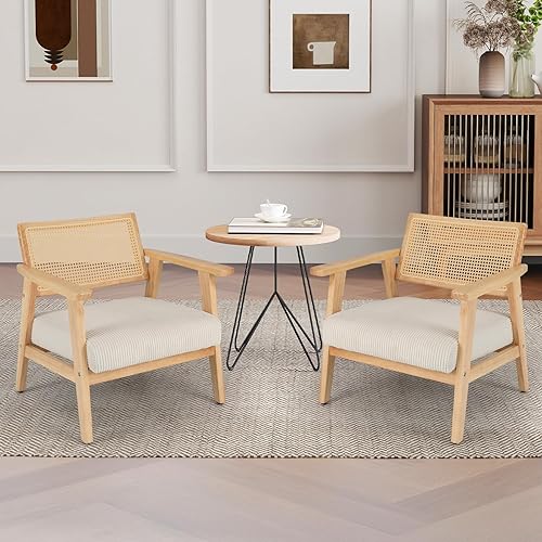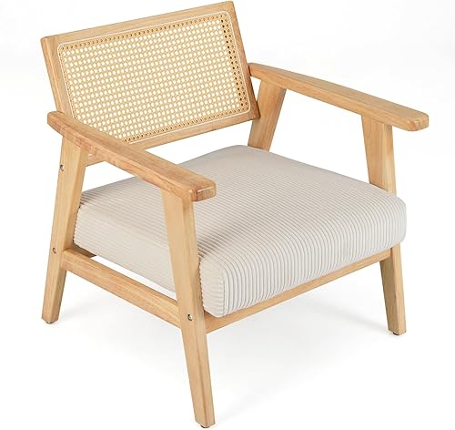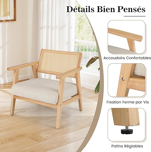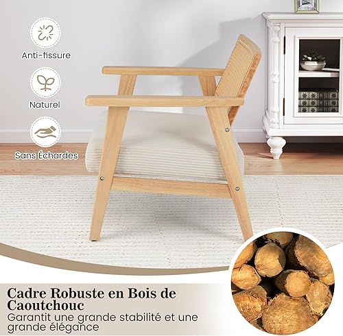 COSTWAY Chaise d'Appoint en Velours Côtelé, Chaise de Loisirs d'ntérieur avec Siège Rembourré et Dossier en Rotin, Fauteuil Rembourré en Bois d'Hévéa, pour Chambre, Salon, Bureau, Naturel