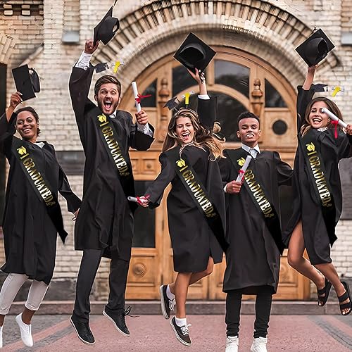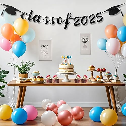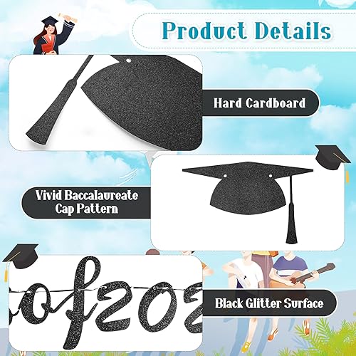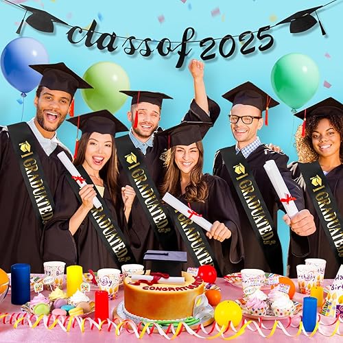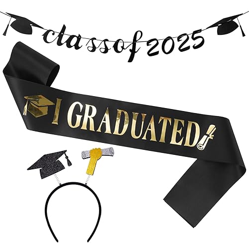 Kit guirlande décorative noire à paillettes pour remise de diplôme, bannière en papier 2025 avec 1 serre-tête de chapeau de diplômé et 1 ceinture pour l'obtention d'un diplôme, un baccalauréat et un
