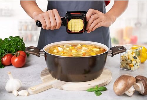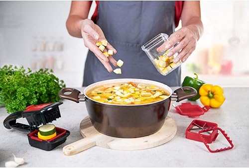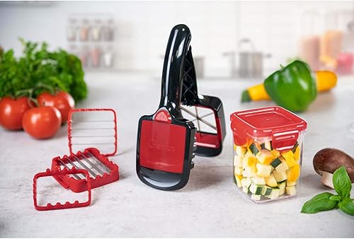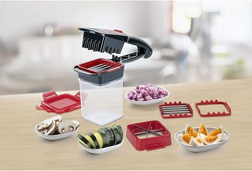 Genius A27165 Nicer Dicer Quick XXL Set de 7 pièces Le hachoir avec 3 lames interchangeables et un bac de récupération de 320 ml en format main | 30 dés ou 10 disques en un clic en acier inoxydable