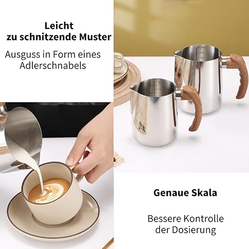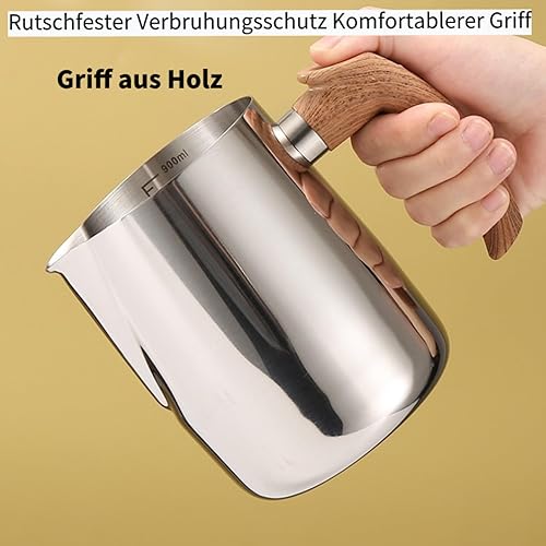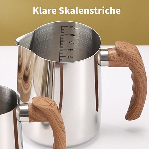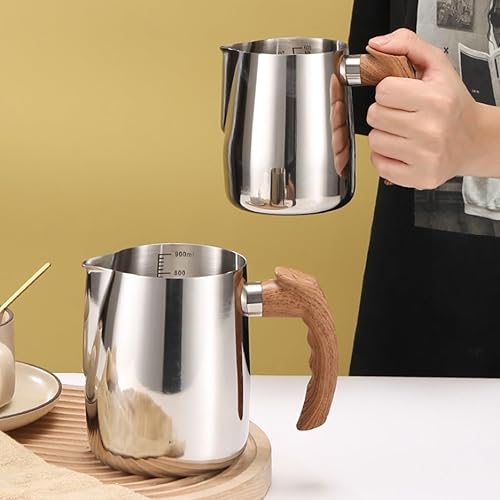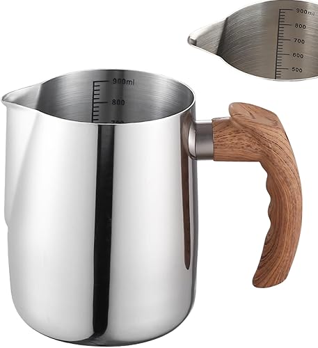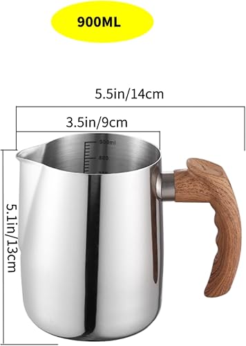 Pichet à lait pour machine à café, pichet à mousse de lait en acier inoxydable 304, poignée en bois confortable, carafe à vapeur pour barista, latte art, cappuccino, expresso (900 ml)