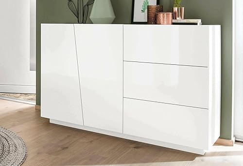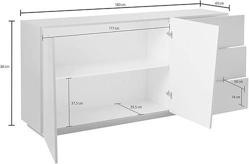 Dmora - Buffet John, Buffet de cuisine avec 2 portes et 3 tiroirs, Buffet de salon, 100% Made in Italy, 180x43h86 cm, Blanc brillant