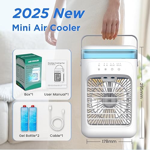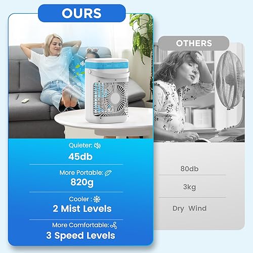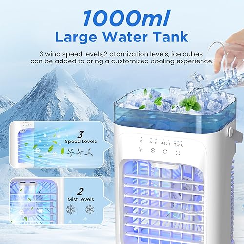 SWGOTA Climatiseur Mobile 1000 ml, Refroidisseur d'air 4 en 1, Climatiseur Portable avec 3 Vitesses, Veilleuse 7 Couleurs, Minuteur 2-4H, Ventilateur Brumisateur pour Chambre à Coucher, Bureau, Salon