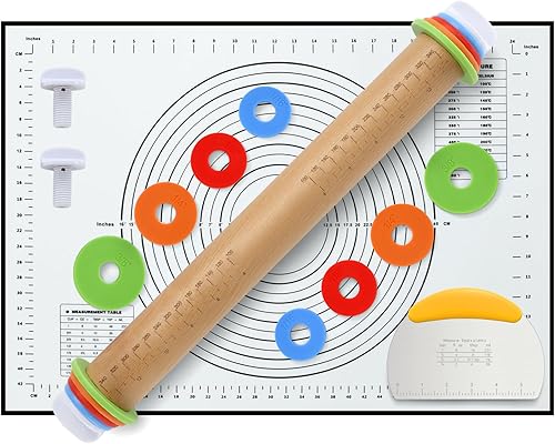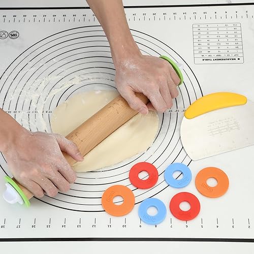 Unokit 3 pièces Ustensiles à Pâtisserie,Rouleau Patisserie Bois a Vec Anneau épais, Tapis en Silicone Antidérapant Surdimensionné et Coupe Pate graduée