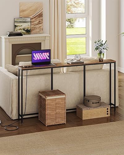 CHOEZON Table de Console de 160 cm, Table d’Entrée avec Station de Charge, Bout de Canapé étroit avec 2 Prises et 2 USB, Style Industriel, pour Salon, entrée, Marron Rustique et Noir DTXG16CBF
