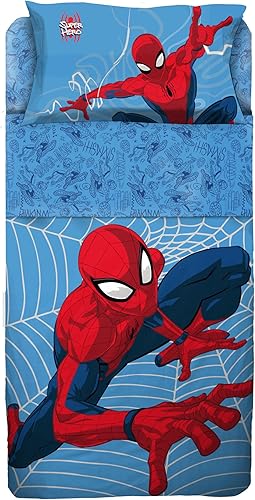Parure de lit 1 Personne Spiderman 100% Coton, Parure de lit, Drap de Dessus avec Ribaltina + Drap Housse + taie d'oreiller