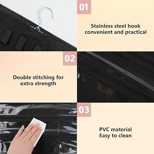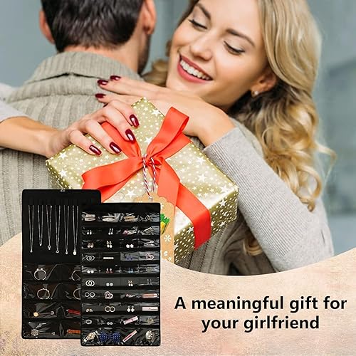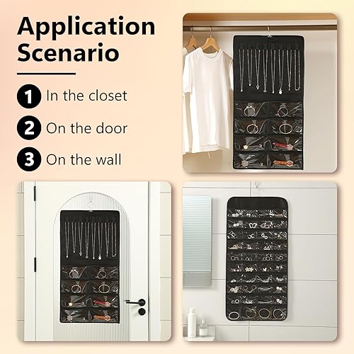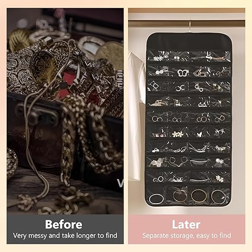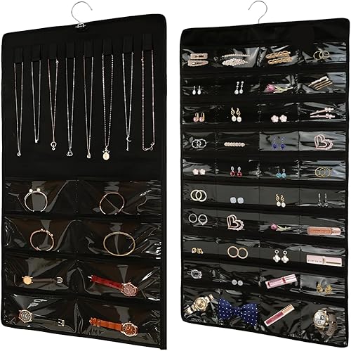 KUAOOAUK Hanging Organiseur de bijoux, 48 poches, grande armoire, porte-collier, support de bijoux double face avec anse en acier inoxydable pour boucles d'oreilles, bracelet, bagues, chaîne, sur le