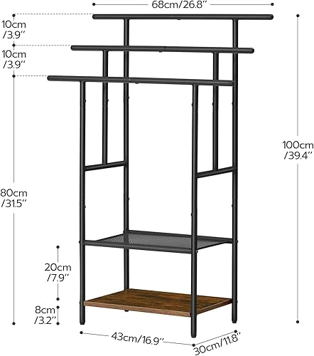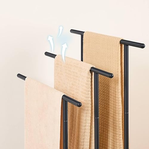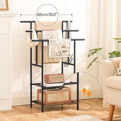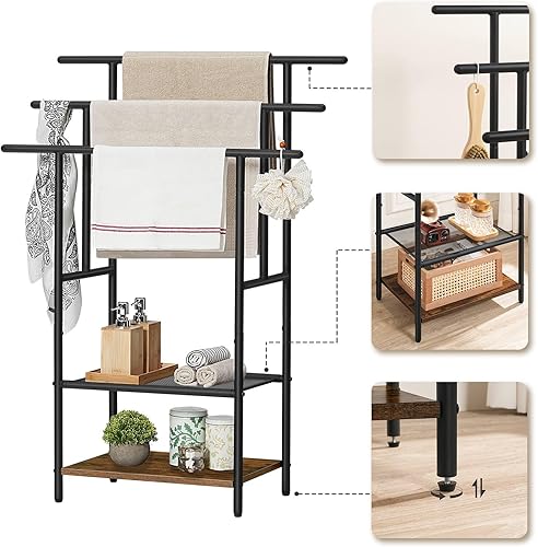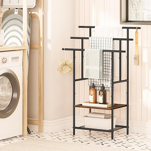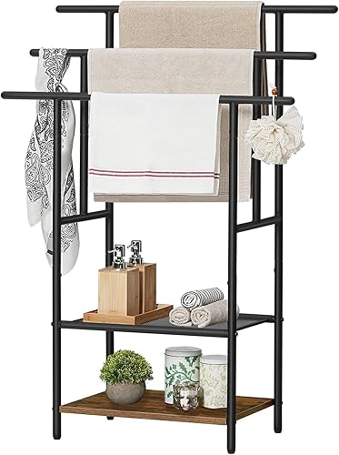 HOOBRO Porte-Serviettes sur Pieds, Range-Serviettes, avec 3 Barres, Support Salle de Bain, 2 étagères, Étendoir, pour Serviettes, Couvertures, Journaux, Marron Rustique et Noir EBF05LB01