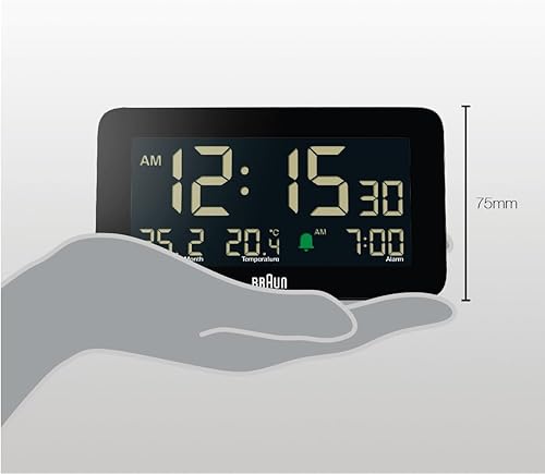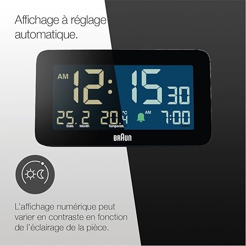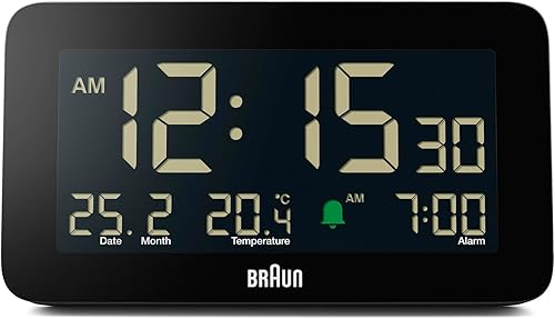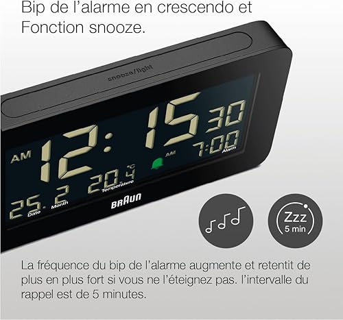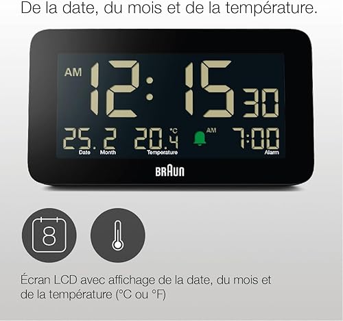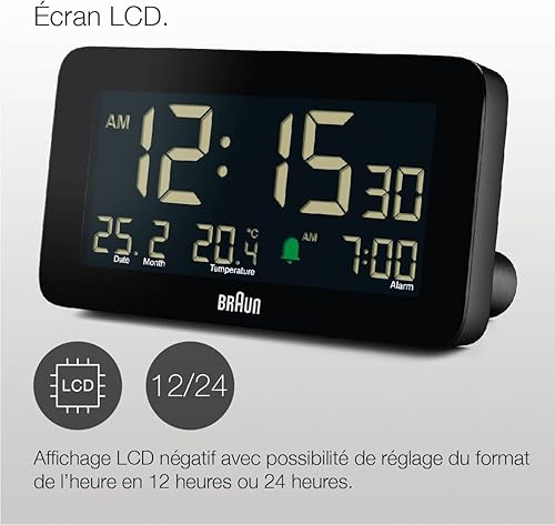 Braun Réveil numérique avec Affichage de la Date, du Mois et de la température, écran LCD négatif, réglage Rapide, Alarme Crescendo Beep en Noir, modèle BC10B (1 Paquet)