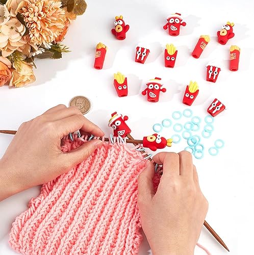GOMAKERER 20pcs 5 styles Bouchons D'Aiguille à Tricoter et 50pcs anneaux Marqueurs de Point de Tricot, Thème de Restauration Rapide Points D'Aiguilles à Tricoter en Silicone pour le Bricolage