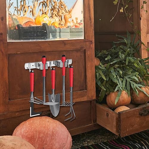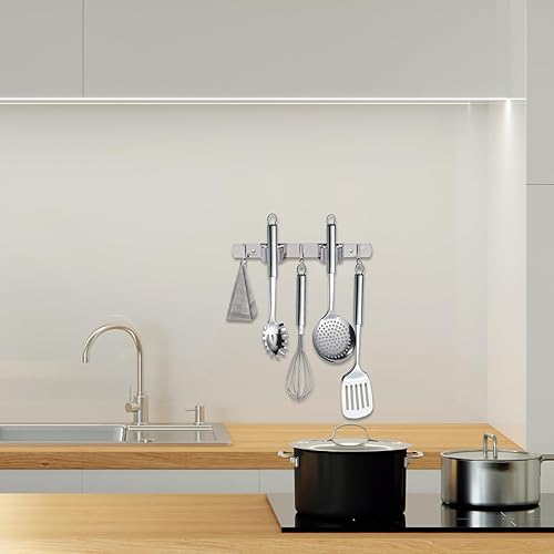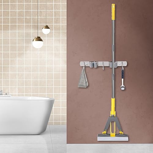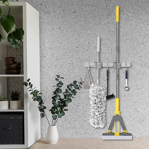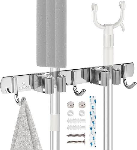 BigKego Support mural autocollant pour balai en acier inoxydable avec 2 supports et 3 crochets pour cuisine, salle de bain, jardin, balcon, garage