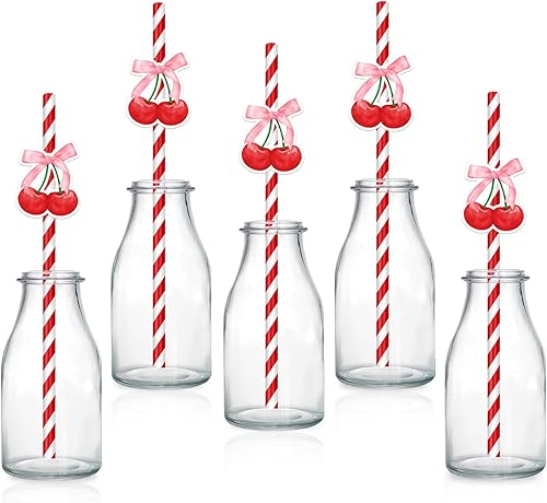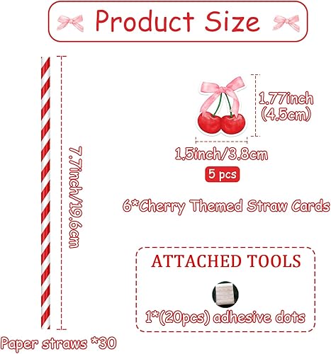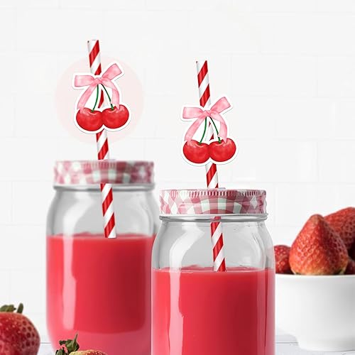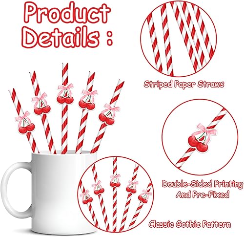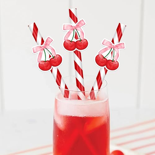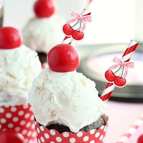 Lot de 30 pailles en papier recyclables sur le thème des cerises - Rayures rouges cerise - Pour fête, restaurant, jus, café, boissons froides - Pour anniversaire, mariage et fête