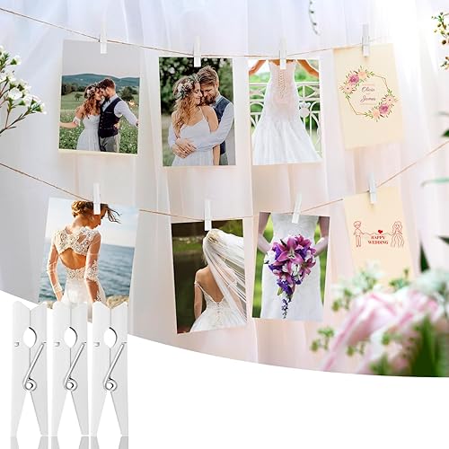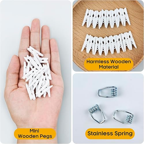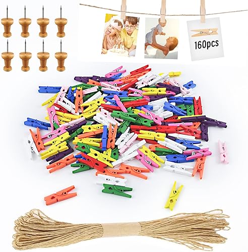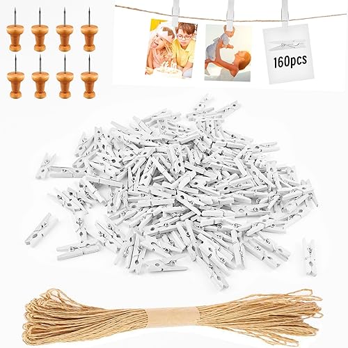 Hengxinc Lot de 168 Mini Pinces à Linge en Bois Blanc 25MM - Pour Mariage, Polaroid et Photos - Avec 10M de Corde de Jute - DIY