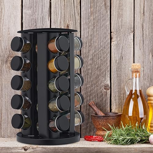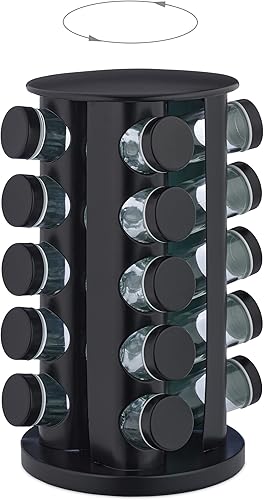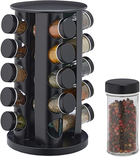 Relaxdays Tourniquet à épices avec 20 Pots en Verre, Rotatif, Embouts tamiseur, remplir, pour la Cuisine, Noir