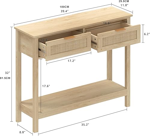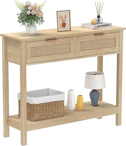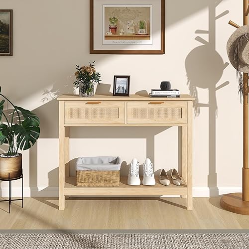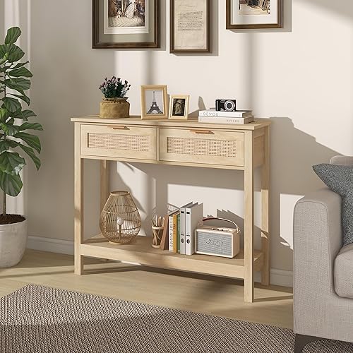 Trironsun Table console bohème en rotin avec 2 tiroirs, table d'entrée à 2 étages, maison de ferme en bois avec étagère de rangement ouverte pour salon, couloir, foyer