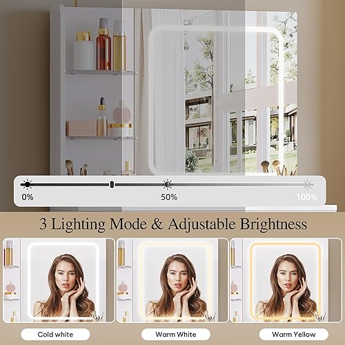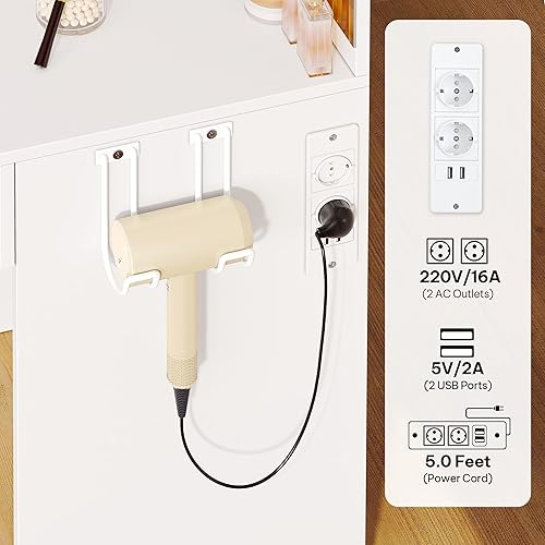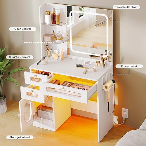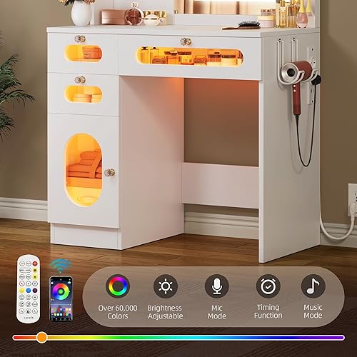 YITAHOME Grande Coiffeuse avec Miroir LED et Prises 3 Couleurs Luminosité Réglable, Blanche Bureau Coiffeuse avec Tabouret 5 Tiroir et 2 Armoire 4 Étagères Rangement, RGB Moderne Couffeuse