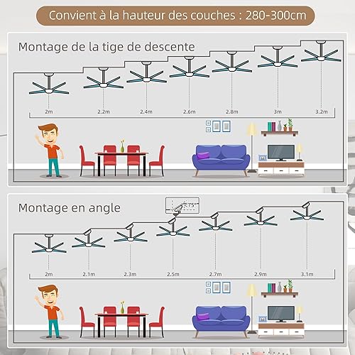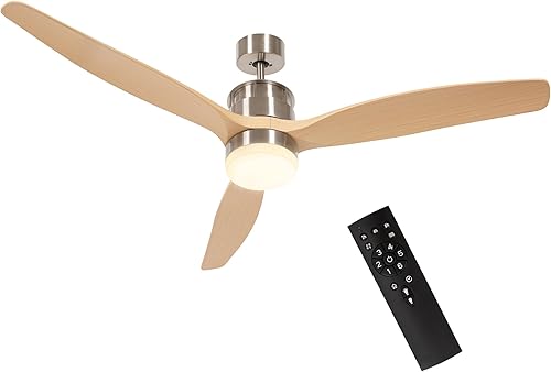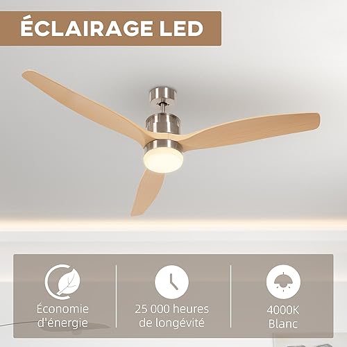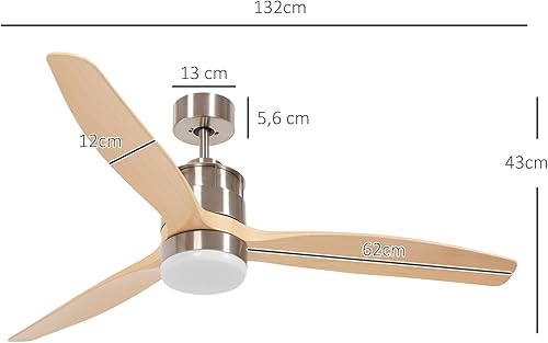 HOMCOM Ventilateur de plafond avec lumière, 6 vitesses, moteur réversible silencieux, avec télécommande, diamètre 132 cm, naturel