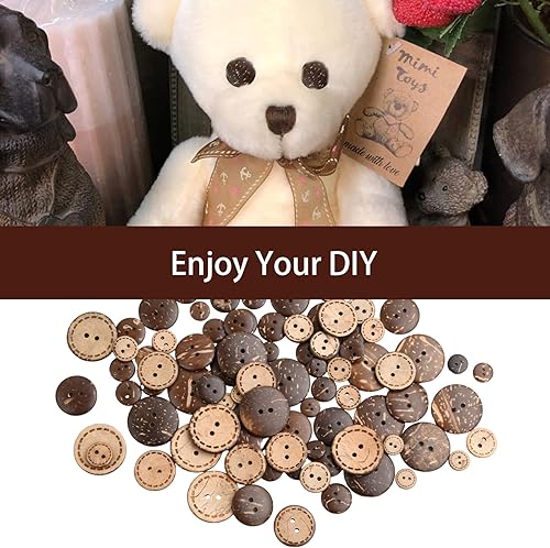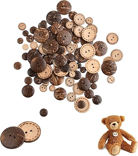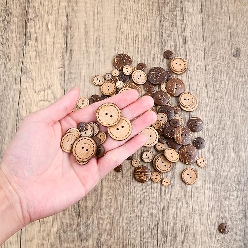 Dokeno Boutons de Noix de Coco Naturelle, 100Pcs Marron Boutons de Couture de Coquille 5 Tailles, Bouton en Bois Boutons Ronds 2 Trous pour Vêtement Artisanat Bricolage