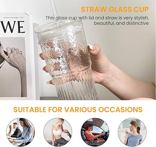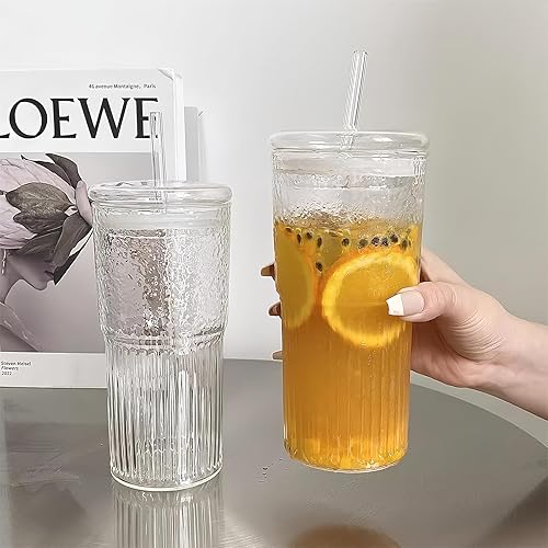 PORFOYO Lot De 2 600ml Verre Canette Avec Couvercle Et Paille,Verre Avec Couvercle Et Paille,Réutilisables Verre Canette Et Paille,Verre Avec Paille Pour Bière,Soda,Cocktails,Smoothie