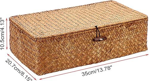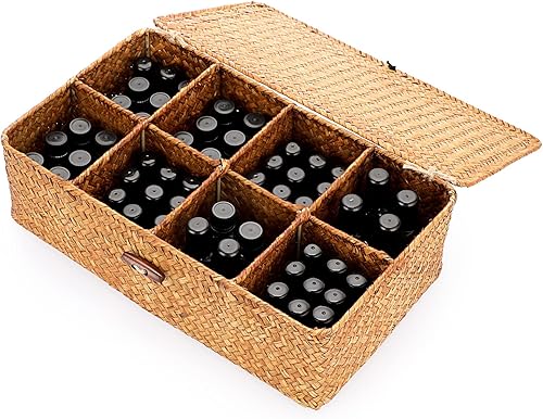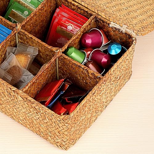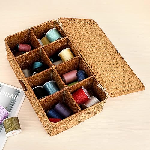 OLegei Panier de rangement en osier panier d’étagère boîte de rangement avec couvercle et 8 compartiments organisateur de table pour comptoir, bureau, étagère (caramel)