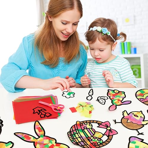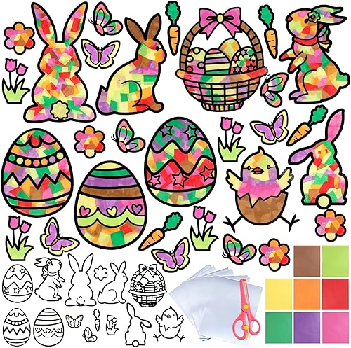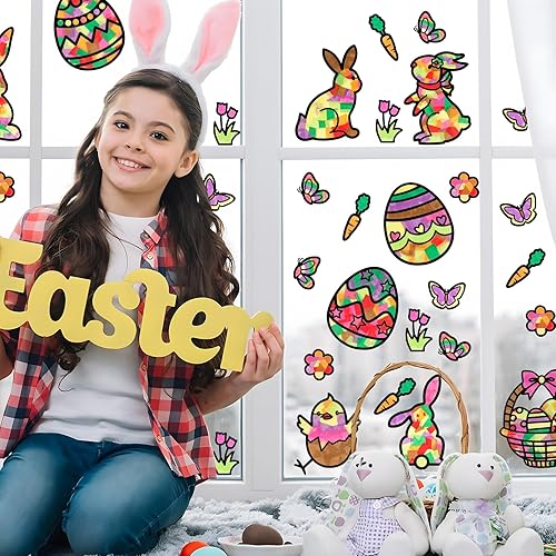 Kit de Décoration de Pâques 29pcs Autocollants Fenêtre Pochoirs Papillon Fleur Poussin Lapin Œufs Gommette Stickers et 32Feuilles Papiers Colorés DIY Décoration pour Enfant Pâques Fête Jardin Party