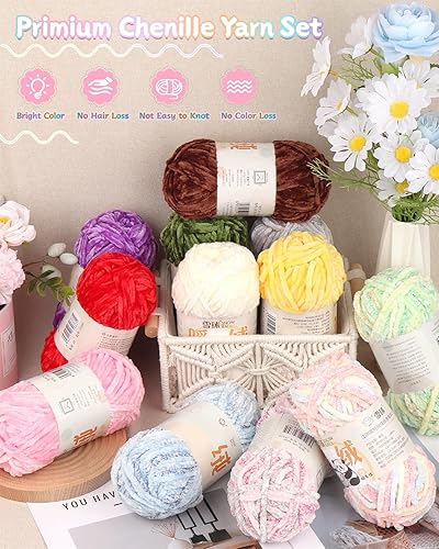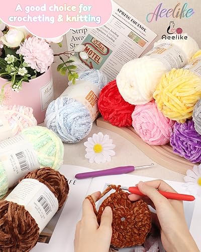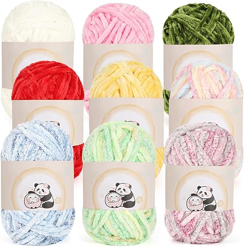 Aeelike Lot de 9 pelotes de laine chenille de 100 g de fil à crochet super doux pour le tissage à la main avec 1 sac de rangement transparent