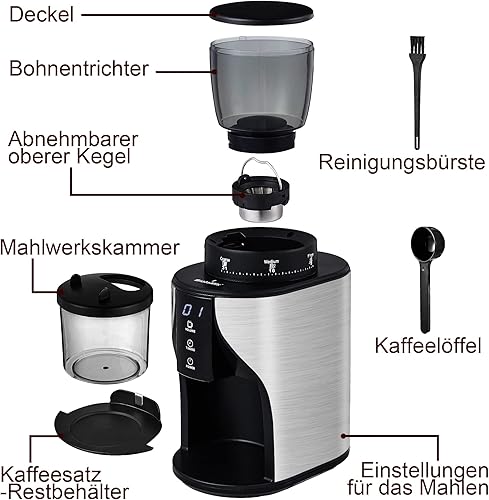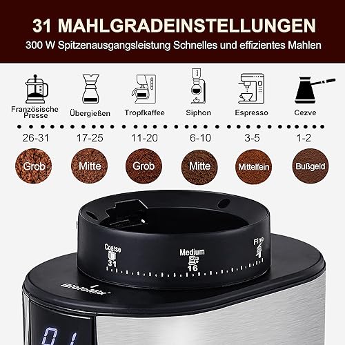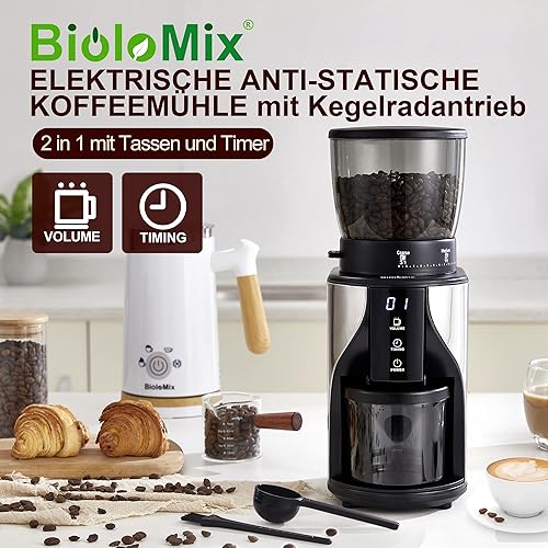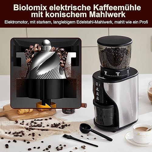 Biolomix Moulin à café électrique électrique avec 31 réglages de broyage, broyeur conique, pour 1 à 10 portions d'expresso, goutte à goutte, presse française et brosse de nettoyage pour café filtre