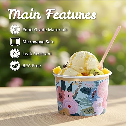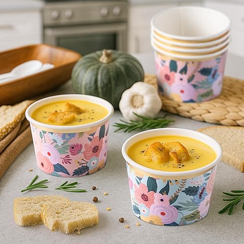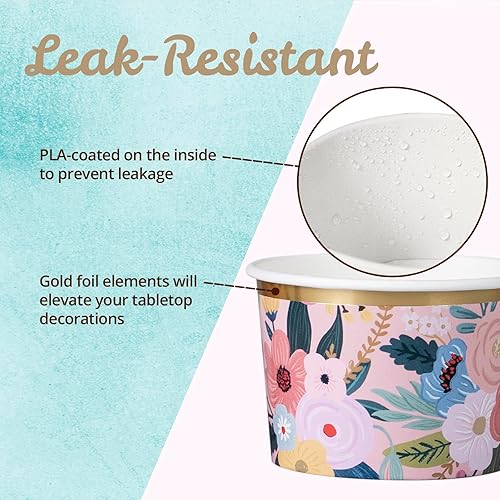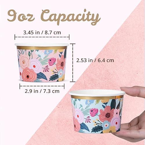 Lot de 50 Pots Glace 266 ml et Coupelles Jetables – Bols en Papier avec Motif Floral et Bord Doré – Pot à Glace Jetable, Coupelle Jetable Chaud/Froid pour Fêtes, Mariages, Desserts et Soupes