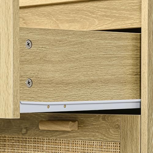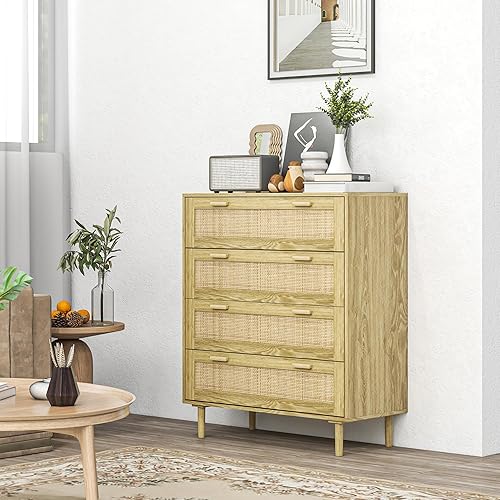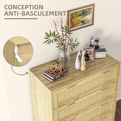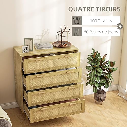 HOMCOM Commode Chambre 4 tiroirs, Meuble de Rangement Style bohème avec façade Tissage en résine tressée, 90 x 45 x 108,5 cm, chêne